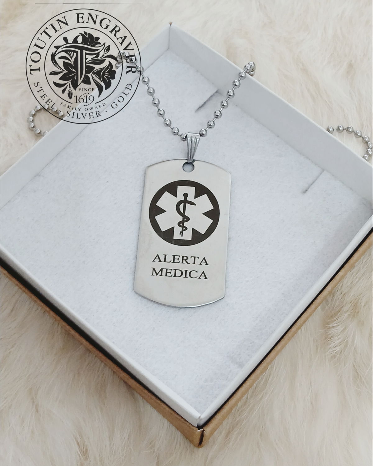 El dije mide 40x22mm. Cadena de Acero de 50cm. Puedes grabar datos personales, logos y frases
