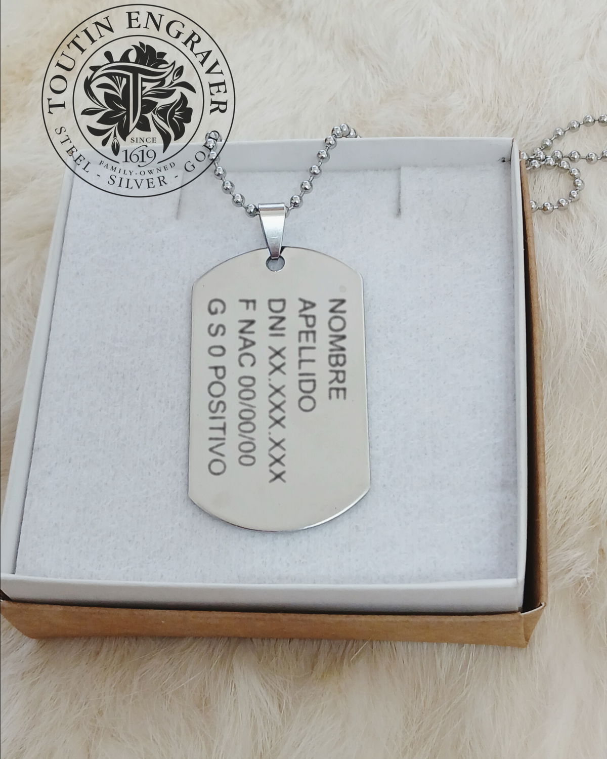 El dije mide 50x30mm. Cadena Acero de 50/60cm. El precio incluye el grabado de ambos lados. Puede grabar datos personales, logos y frases.